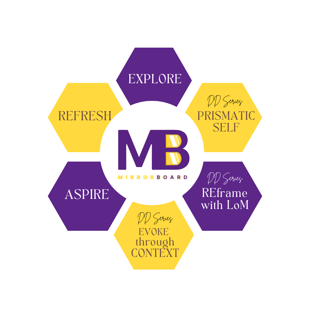 Explore with Mirror Board - The Explore playshop teaches participants the art /fun/ play of the foundational Mirror Board Reflectional Activity, learning how to ReDiscover and Reframe, Embody and Envision, and Name and Claim at least two of their personal Reflections.